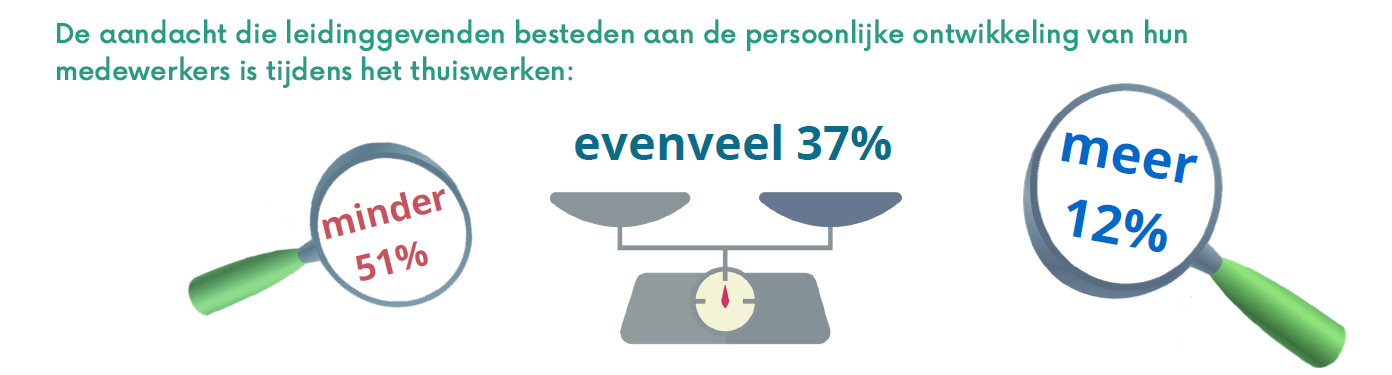 Maar die businesscase komt niet zonder humane kosten. Ook al hebben we in Nederland een soepele overgang naar thuiswerken gemaakt, het gaat gepaard met substantiële risico’s die makkelijk groter kunnen worden als we massaal blijven thuiswerken. HR-professionals zien wel degelijk flink wat leidinggevenden met aansturingsproblemen nu zo veel mensen thuiswerken. Ook zien ze dat vitaliteit, zowel fysiek als mentaal, evenals samenwerking tussen medewerkers te lijden hebben onder het permanente thuiswerken. Leren en ontwikkelen krijgen wel aandacht – iedereen leert nieuwe manieren van (digitaal) werken en ook online leren wordt gewoner. Maar de bredere, persoonlijke ontwikkeling krijgt minder aandacht van zowel medewerkers zelf als hun leidinggevenden. En duurzame inzetbaarheid staat nu minder prominent op de strategische agenda van organisaties dan vorig jaar.